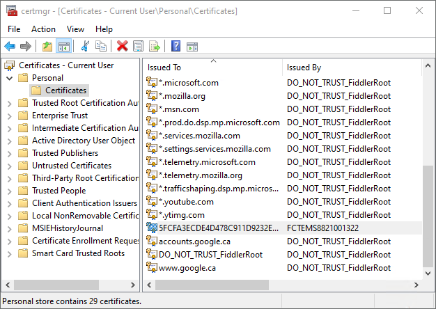 In the certificate manager, go to Certificates - Current User > Personal > Certificates and find the certificate that is issued by the FortiClient EMS.