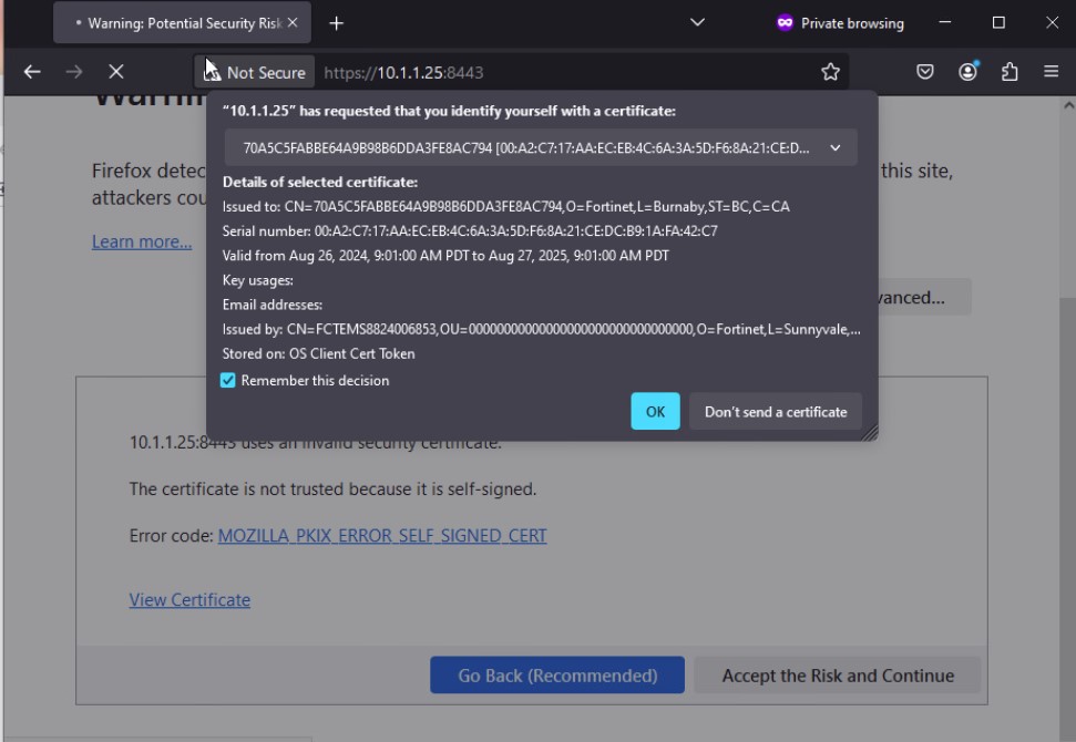 The browser prompts the user for a client certificate. The user selects the certificate and clicks OK. Then the endpoint device presents the client certificate to FortiProxy for verification.