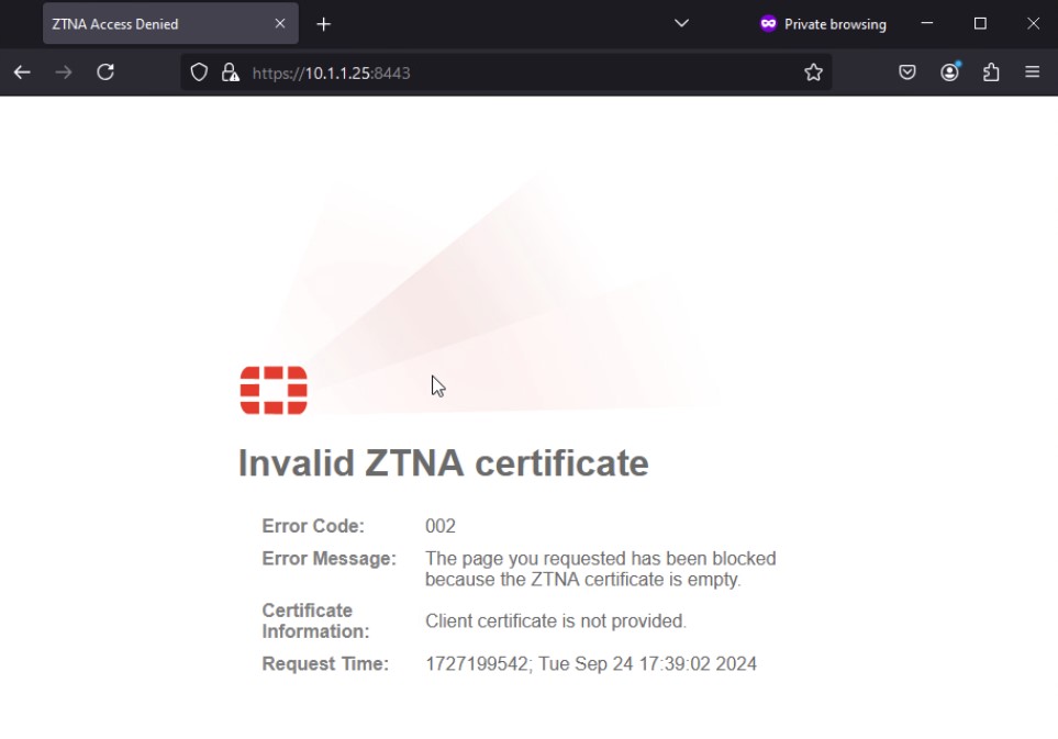 When the endpoint device fails to present a client certificate, a message is displayed, and access to the web site is blocked.