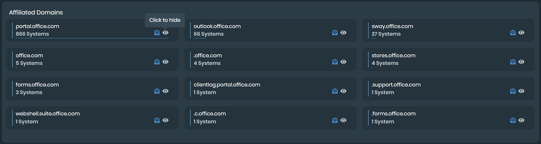 - Scroll down to the Affiliated Domains section, and click the Click to Hide icon for the domains you want to hide.