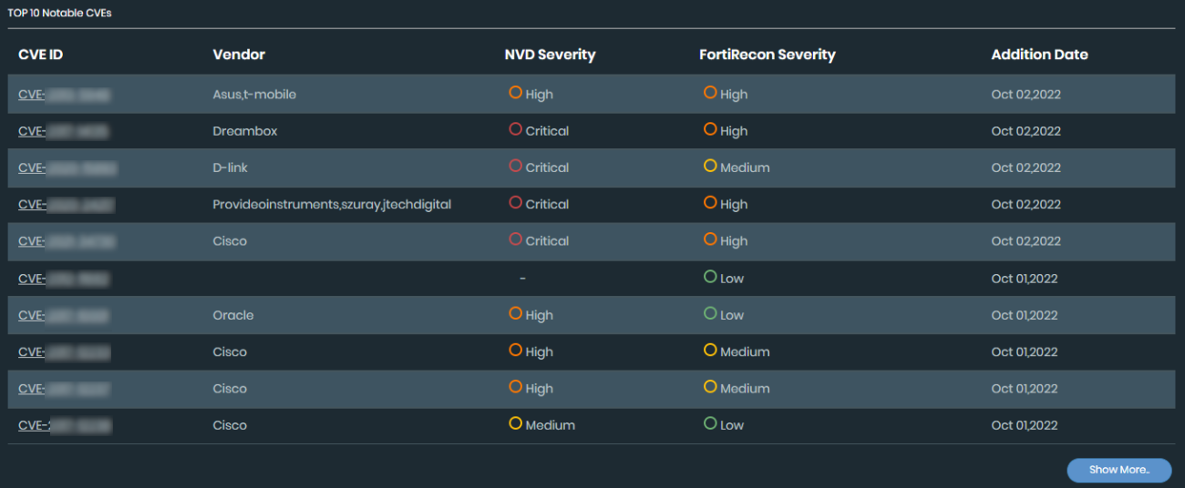 Top 10 Notable CVEs: Displays a list of the notable CVE monitored and the severity range from Low to Critical. Select the CVE ID or Show More button to view more information.