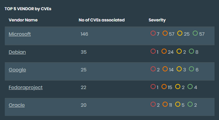 Top 5 vendors by CVEs: Displays a list of the vendors with the most notable CVEs monitored and the severity range from Low to Critical. Select a Vendor Name to view more information.
