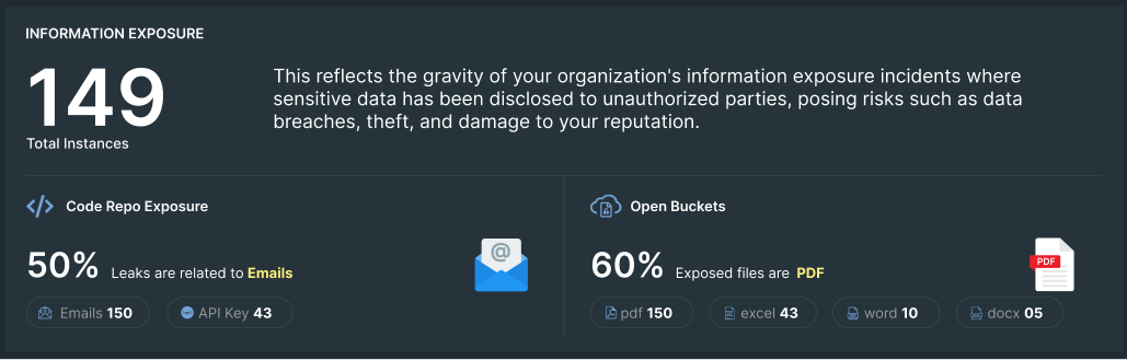 The Dashboard displays information on discovered, exposed information, such as code and file exposure in the Information Exposure widget.