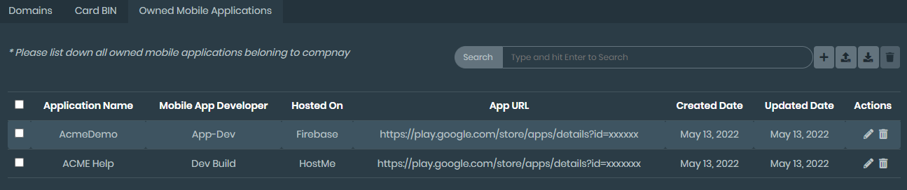 Providing app information allows FortiRecon to monitor for rogue mobile apps that are trying to impersonate your organization. See Rogue Mobile Apps.