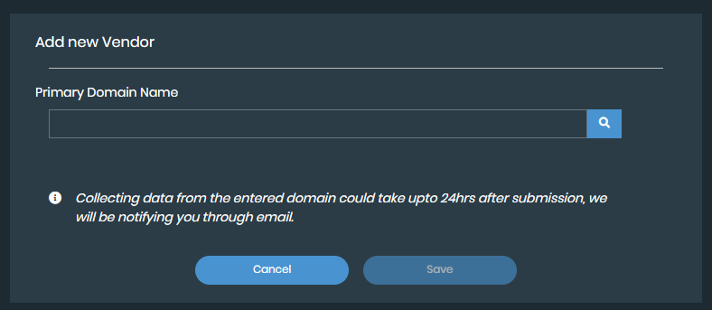 You can add new vendors to the watchlist to generate a risk assessment report and identify the overall estimate risk exposure rating. Vendors can be added to the watchlist using the primary domain. Once the domain name has been submitted, collecting data and generating the risk assessment can take up to 24 hours.