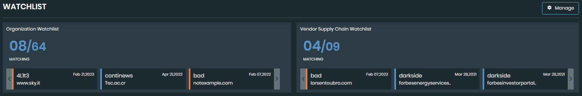 Watchlist: A list of monitored organization and vendors. If an asset matches a monitor, an alert will be triggered. Add or edit your watchlist by selecting Manage.