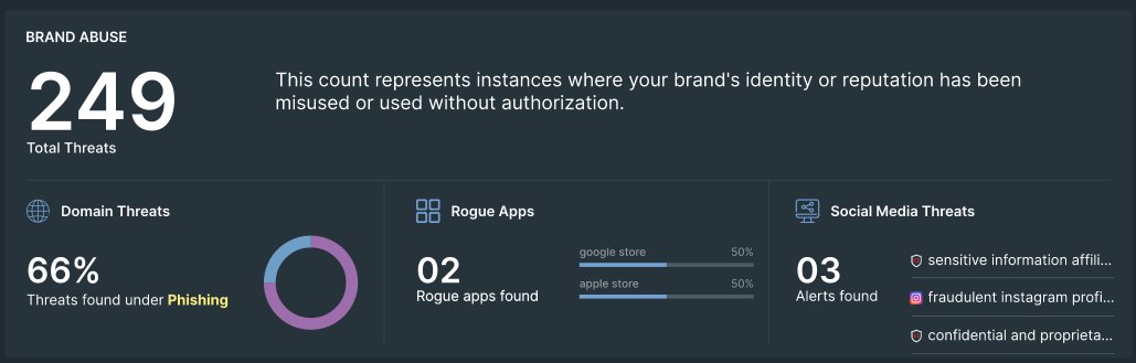 The Dashboard displays information on domain phishing, rogue apps, and social media threats in the Brand Abuse widget.
