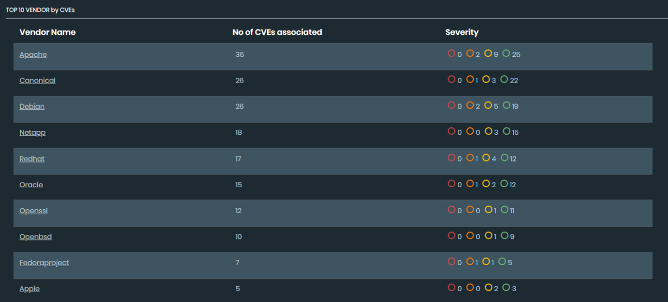 Top 10 vendors by CVEs: Displays a list of the vendors with the most CVEs monitored and the severity range from Low to Critical. Select a Vendor Name or Severity to view more information.