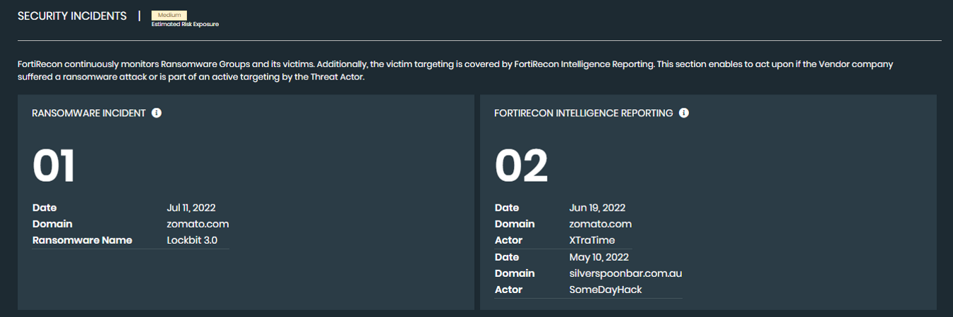 • Security Incidents: Provides an overview of ransomware incidences and intelligence reporting so that action can be taken if the vendor company suffers a ransomware attack or is targeted by a threat actor.