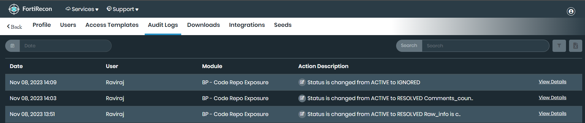 Audit logs capture detailed information about every action taken within FortiRecon, including the date and time of the action, the user responsible, FortiRecon module, and the action description.