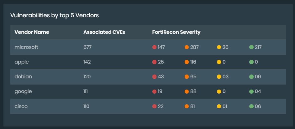 Vulnerabilities by top 5 Vendors: Displays a list of the vendors with the most notable CVEs monitored and the severity range from Low to Critical.