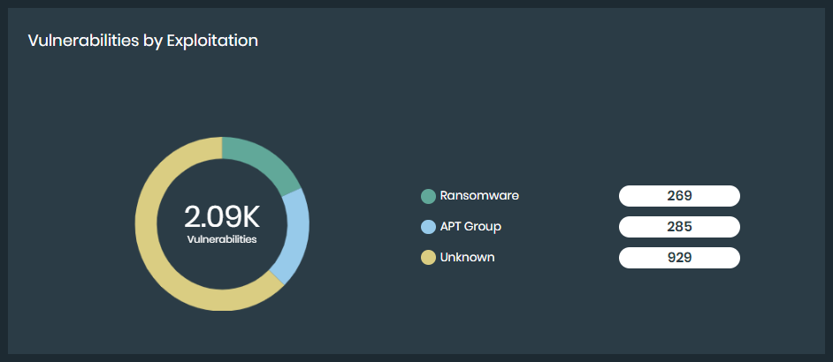 Vulnerabilities by Exploitation: This tile displays the distribution of vulnerabilities based on the availability of known exploits.
