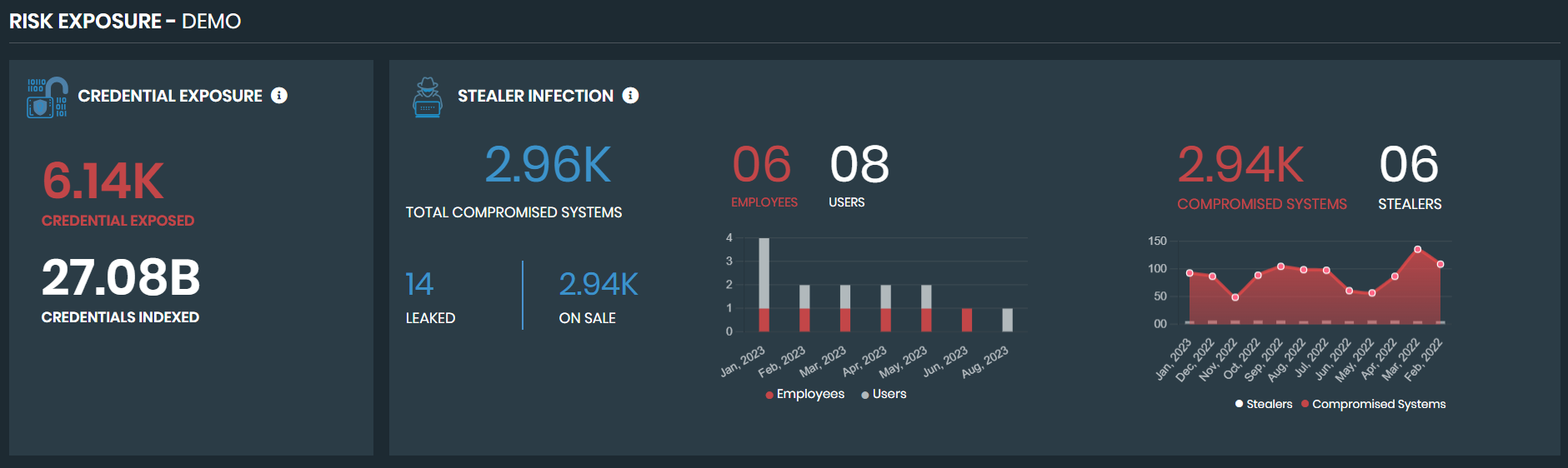Displays data from potentially infected systems that are affiliated with your employees or end-users and are leaked or for sale on credential stealer marketplaces on the darknet.