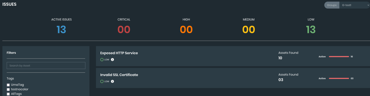 The following example demonstrates filtering by group in the Attack Surface Management > Security Issues page.
