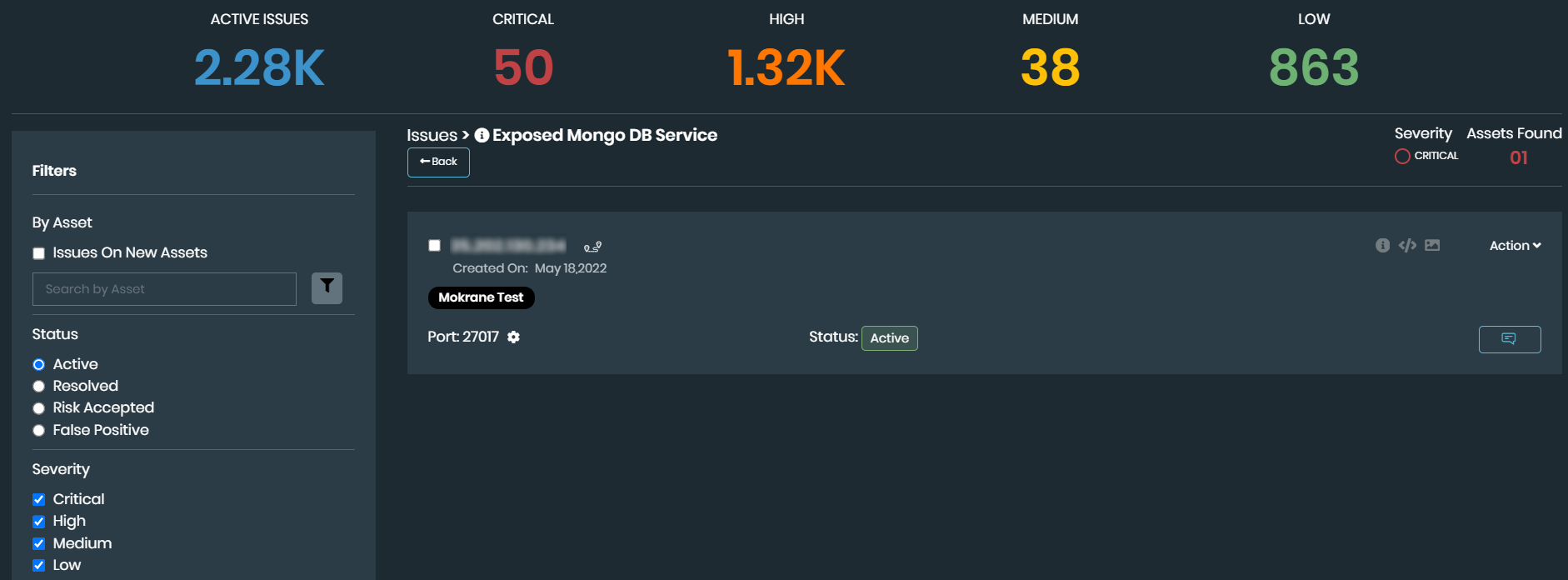 In the following example, the Exposed Mongo DB Service security issue is displayed: