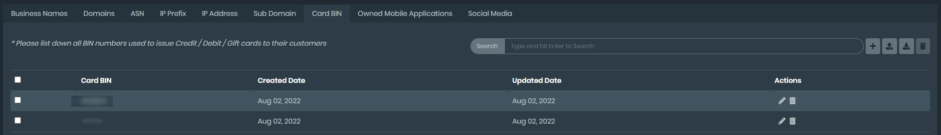 Providing your organization's card bank identification numbers (BINs) allows FortiRecon to monitor for card fraud by actors that may be trying to steal credit, debit, or gift card information. See Card Fraud.