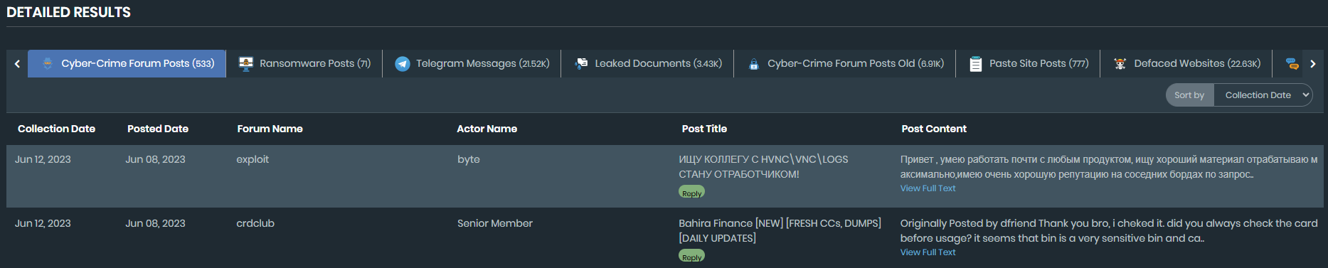 The detailed results section displays the detailed information of the discovered search results. The following data is displayed for each source. Use Sort by dropdown to sort data based on Collection Date, Posted Date, or Updated Date.