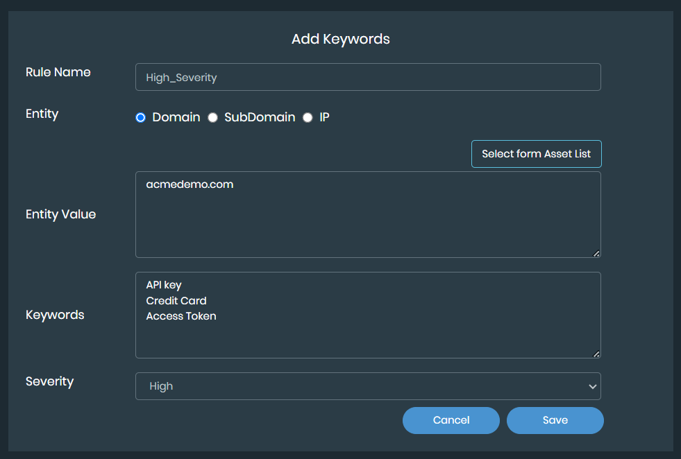 Entity Value: Based on the entity type selected, you can either enter entity values or select the required entities from the Select from Asset List. The Select from Asset List contains a list of assets discovered by the EASM module. You can add multiple entities separated by a comma or by adding each entity in a new line.