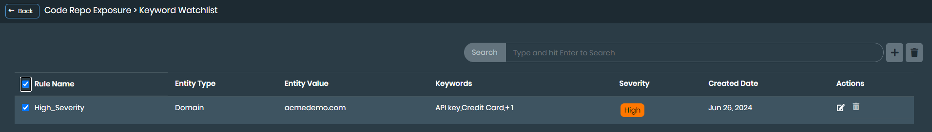 To bulk delete all the rules, select the checkbox in the header. Once all the keywords are selected, click Delete icon next to search bar.