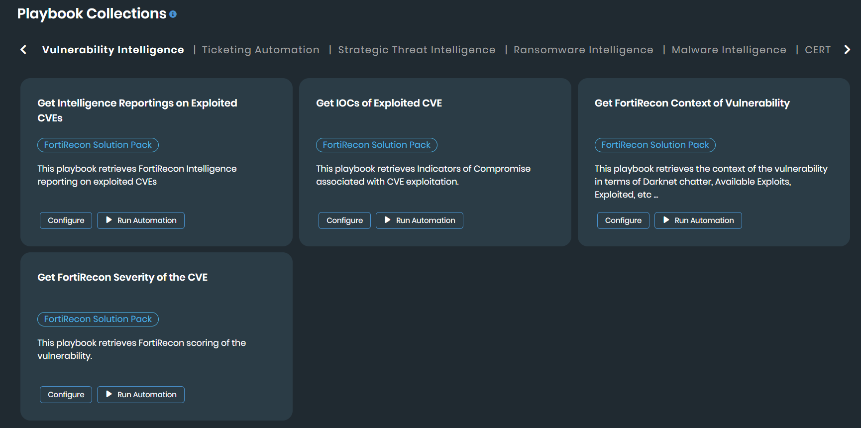 FortiRecon provides the following pre-defined playbook collections that are part of FortiRecon Automation Service Solution Pack to help you quickly get started with common security use cases. To use a playbook from these collections, you must first configure the necessary connectors. The following playbook collections are available.