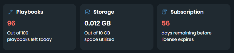 Playbooks: Displays the number of playbooks you can run in a day and the remaining count. You can execute up to 100 playbooks daily.
