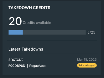 Scroll to the Takedown Credits widget. The number of used, total, and available credits is displayed.
