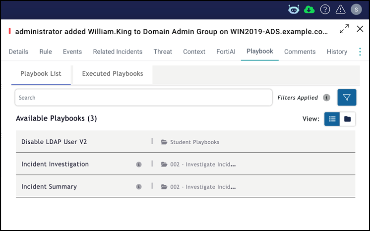 When an Incident is selected, you can execute a playbook from the Incident slide in.