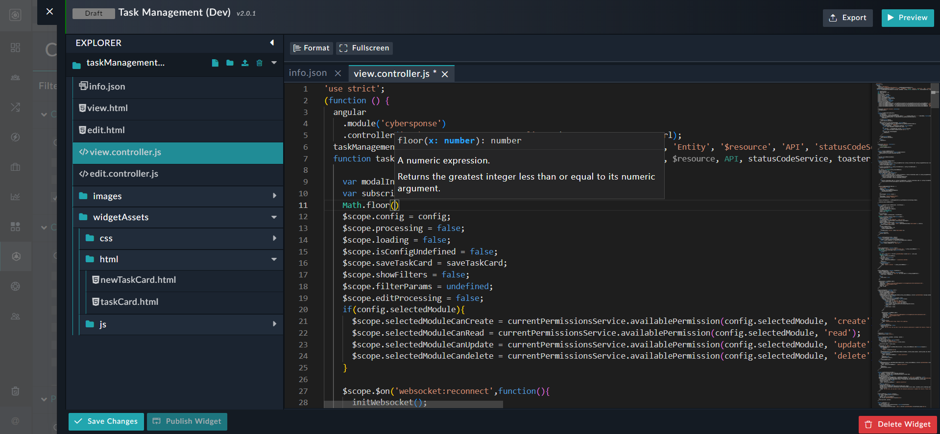 From release 7.6.0 onwards, IntelliSense support has been integrated into the editor used for developing connectors and widgets. For details see the Code Editor with IntelliSense support topic. Additionally, you can perform various actions such as creating or importing files or folders in the code editor.