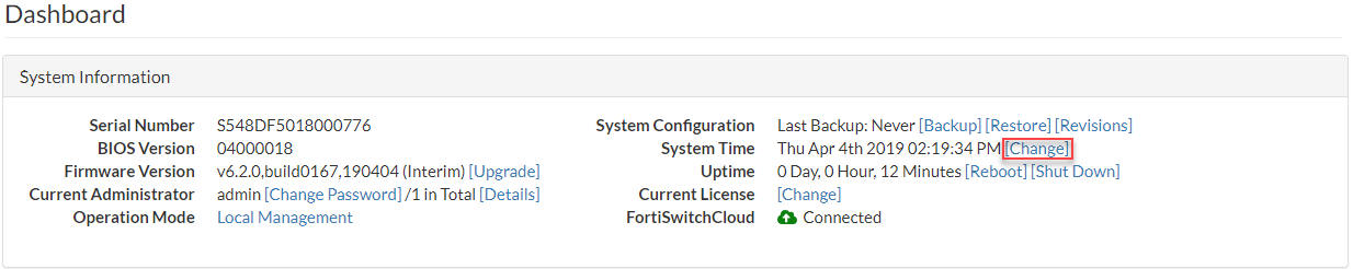 NOTE: Some FortiSwitch models do not have a battery-backup real-time clock. For FortiSwitch models without a real-time clock, the time is reset when the switch is rebooted. These models must be connected to an NTP server if you want to maintain the correct system date and time.