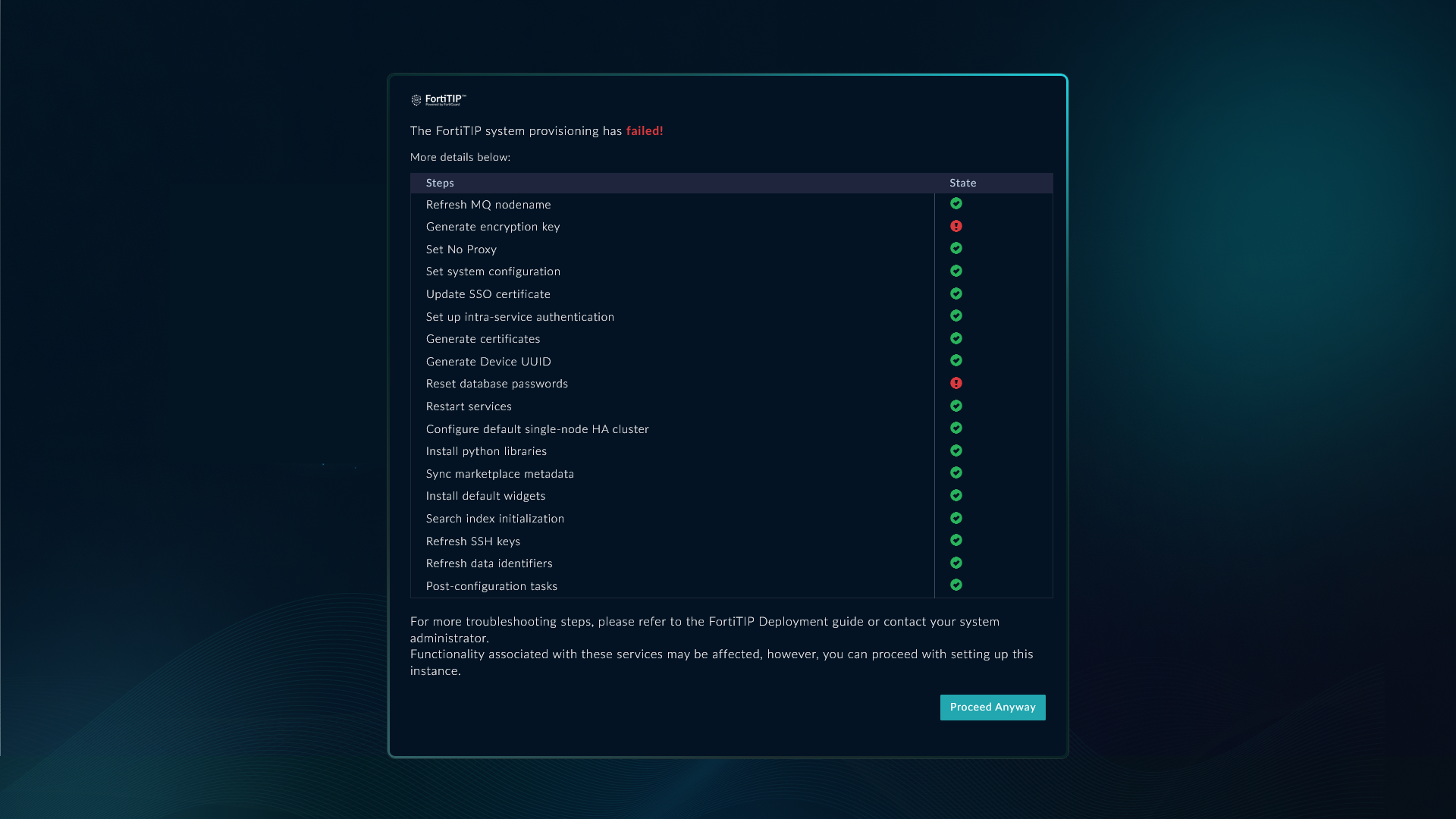 If there are any provisioning issues, such as failures during the initial configuration phase using the automated non-interactive FortiTIP Cloud configuration wizard, including failures while configuring the embedded Secure Message Exchange, then a failure screen detailing the status of each configuration step is displayed, making it simpler to identify the issue. Before using FortiTIP Cloud, you must use WebSSH to resolve the issue before proceeding. If you choose to continue without fixing the issues, FortiTIP Cloud functionality may be impaired. A Proceed Anyway button allows you to continue, acknowledging the configuration failure: