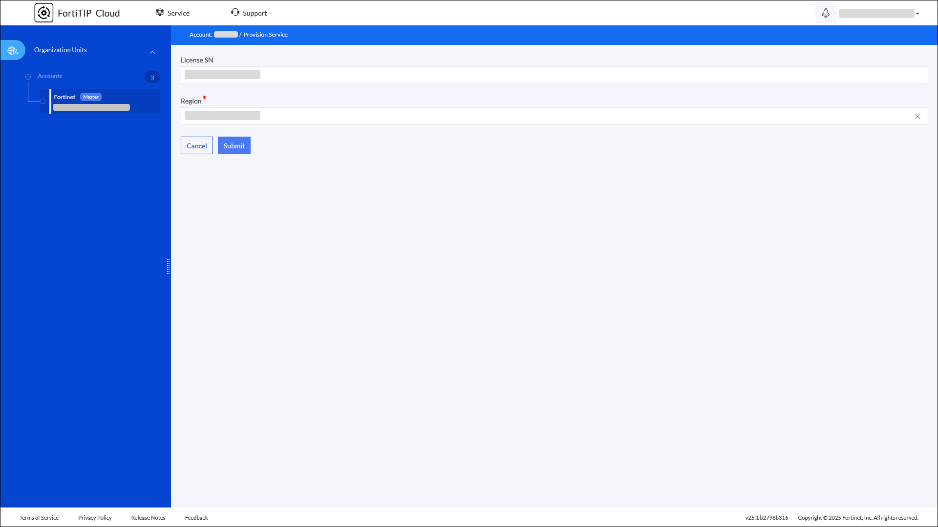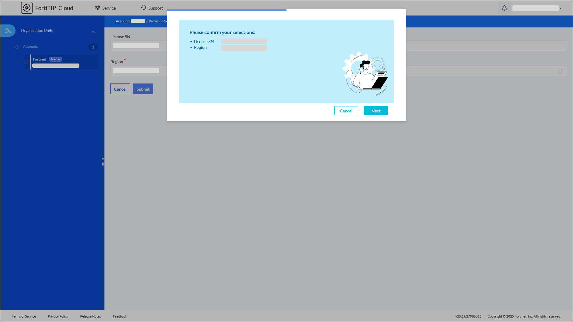 Assetssection, next to the license serial number for the FortiTIP Cloud instance you wish to provision: - Verify the license serial number and select the Region where the instance has to be provisioned.