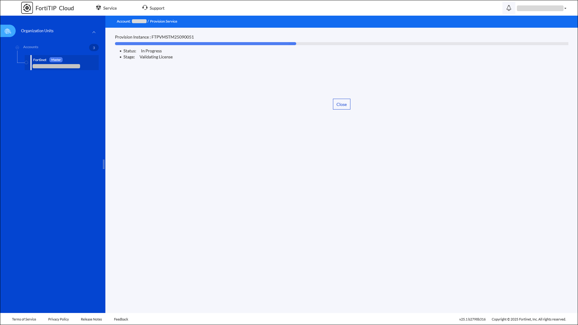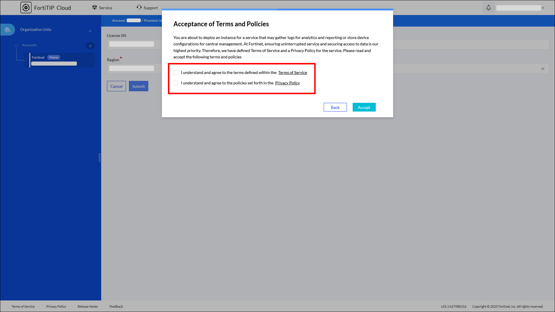 - Select the Terms of Service and Privacy Policy checkboxes and click Accept to initiate the provisioning of the FortiTIP Cloud instance. The provisioning process takes a few minutes.