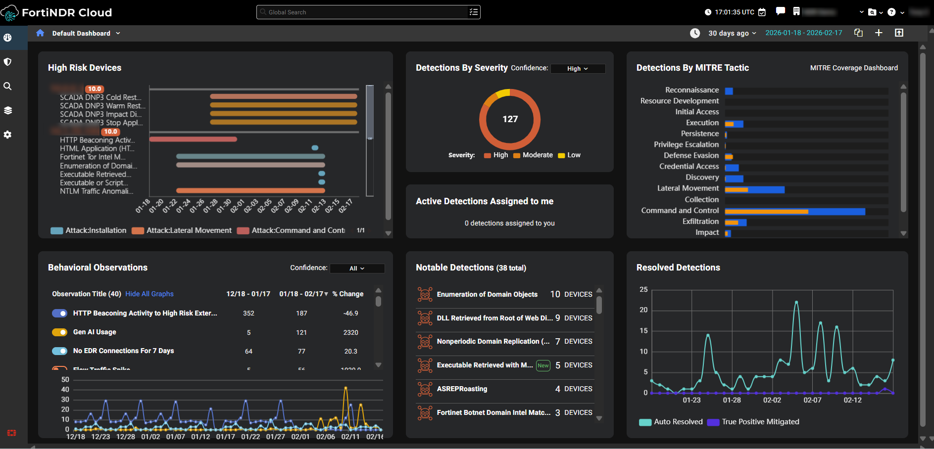 The Default Dashboard organizes detection activity into interactive widgets that display high-risk devices, detection trends, severe threats, and resolved issues over time, helping analysts quickly review threats and prioritize their next steps.