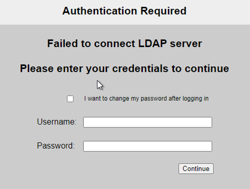 The error messages vary according to different client authentication methods or remote servers. For example, the browser may keep popping up the Sign in window (HTTP Basic Authentication method), or the Authentication Form will prompt a warning message like “Failed to connect LDAP server” or “RADIUS response timeout”, etc.
