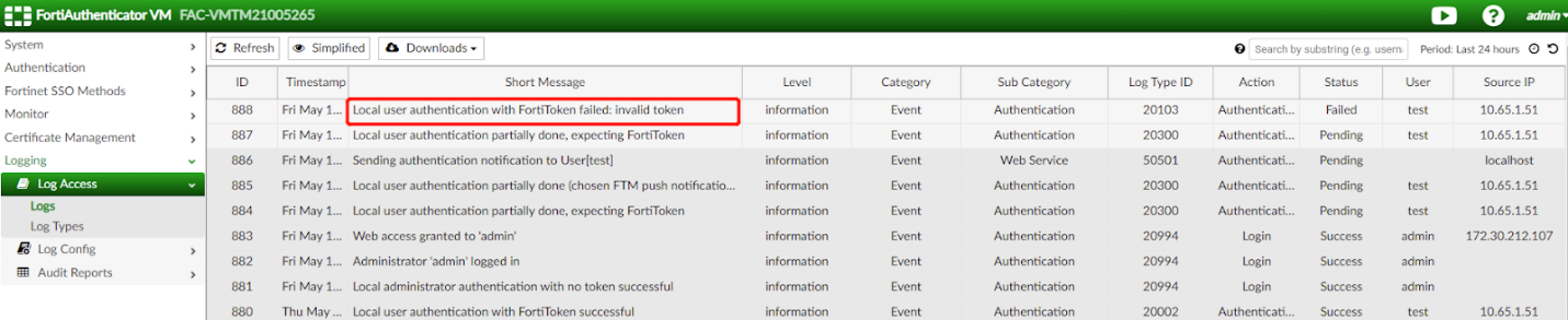 Event logs: FortiAuthenticator > Logging > Log Access > Logs