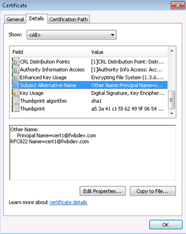 The username we need is cert1@fwbdev.com, then you may specify the location you want, Subject or Subject Alternative Name (SAN). However, the most exact one is UPN (aka Other Name > Principal Name) in SAN, so you’d better keep the default.