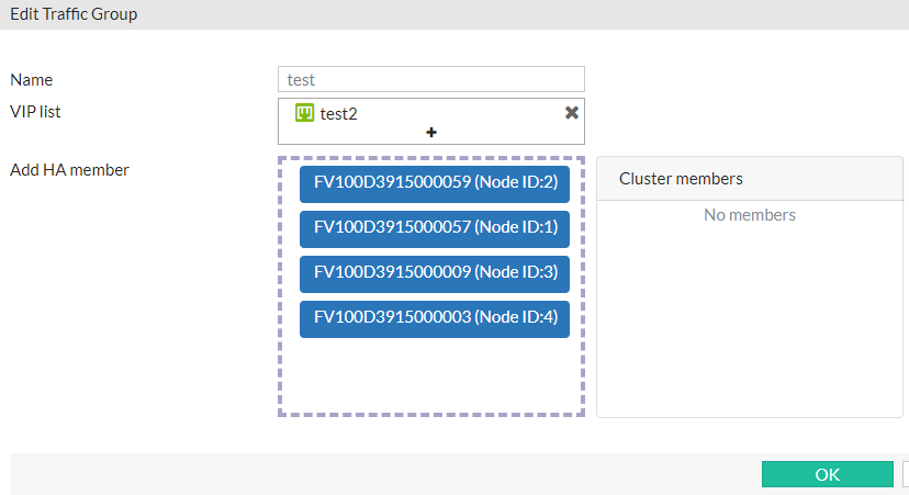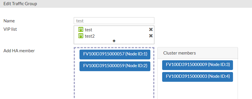- In the Add HA member field, drag the cluster members from the right to the left. Only the appliance ranks the first will be the active node to receive traffic destined to the selected VIP(s). When the active node is down, the appliance lists the next will take over the traffic. You can select the appliance and drag it to change its rank.