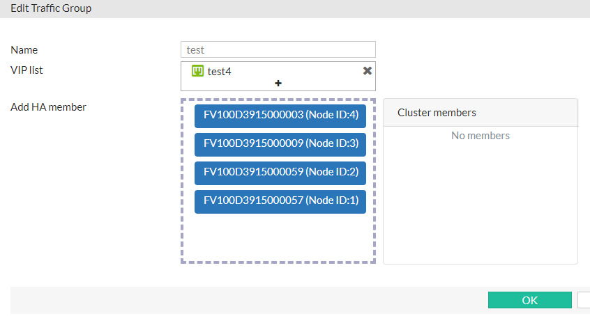 - In the Add HA member field, drag the cluster members from the right to the left. Only the appliance ranks the first will be the active node to receive traffic destined to the selected VIP(s). When the active node is down, the appliance lists the next will take over the traffic. You can select the appliance and drag it to change its rank.