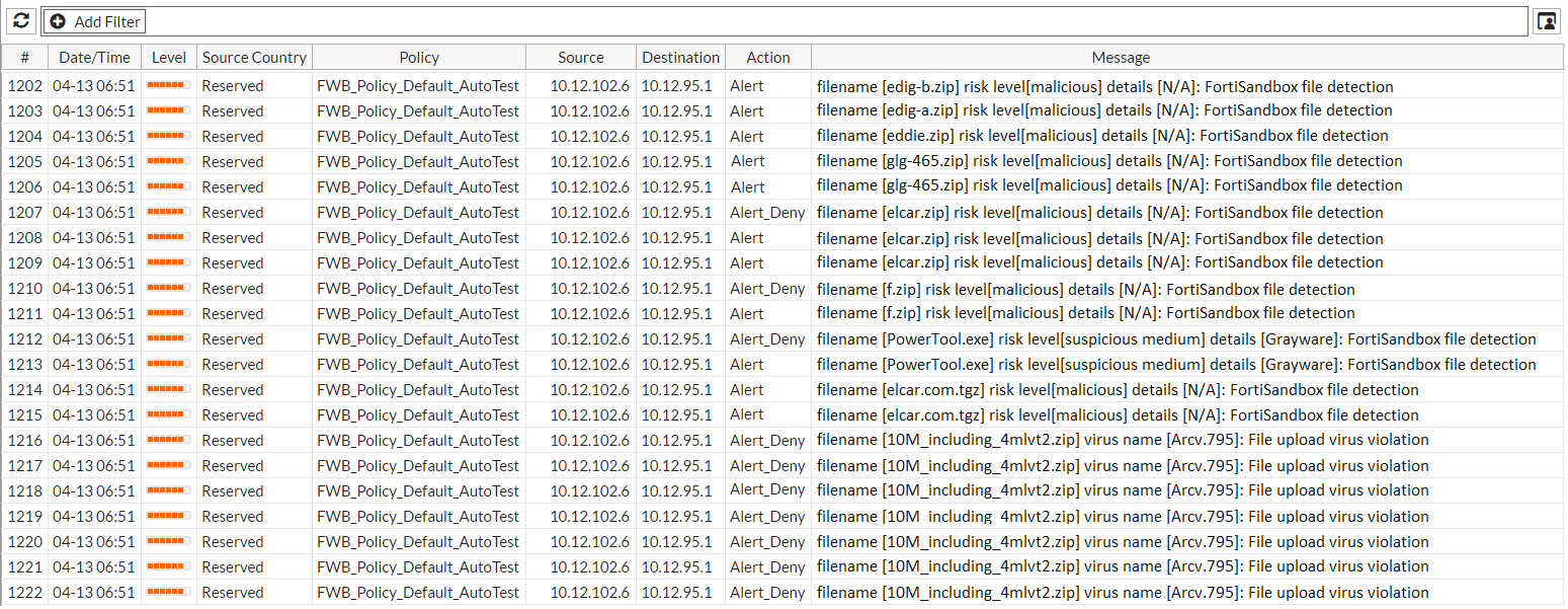 - Take the action specified in the file security policy. During this time, FortiWeb does not resubmit the file to FortiSandbox (for example, messages with the Alert_Deny action in the illustration).