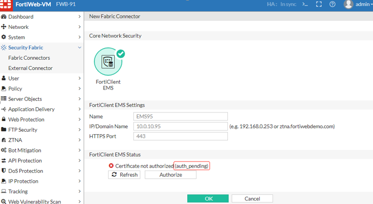 auth_pending: It means FortiWeb has not been authorized by FortiClient EMS, or the FortiClient EMS certificate has not been verified by FortiWeb.