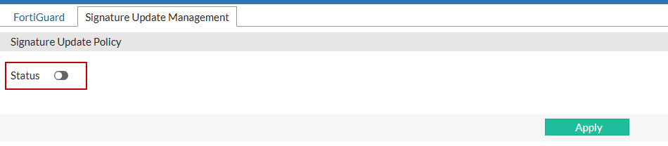 The Status toggle on the Signature Update Management page must be switched on in advance. This ensures that new signatures will appear on this page when a signature update is pulled from FortiGuard, allowing you to review and manage them before they are applied.