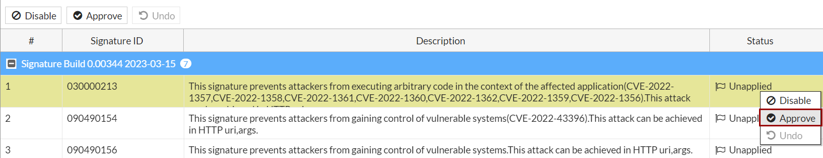 New signatures in the update if any are listed in the table on this page. You can see the signature ID, description, and status (Applied, Unapplied) of each signature. - Select one signature, and you can perform any of the three actions: