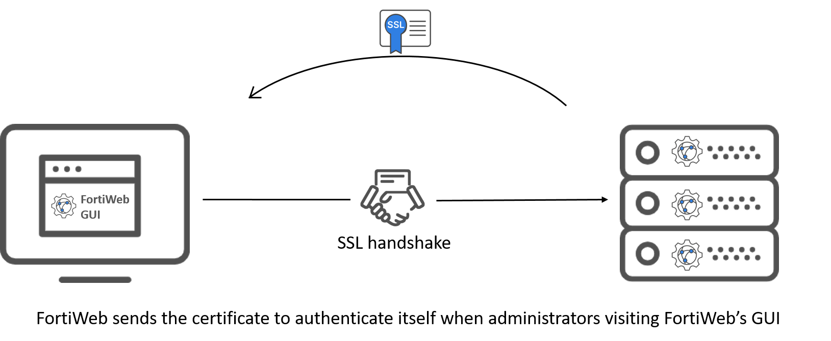 FortiWeb uses admin local certificates to establish secure HTTPS connections when an administrator accesses FortiWeb GUI. When the administrator opens the FortiWeb interface in their web browser, FortiWeb will present this certificate to authenticate itself. This process ensures that the browser can trust FortiWeb and that the communication between the browser and FortiWeb is encrypted, preventing unauthorized access or interception of data during the session.