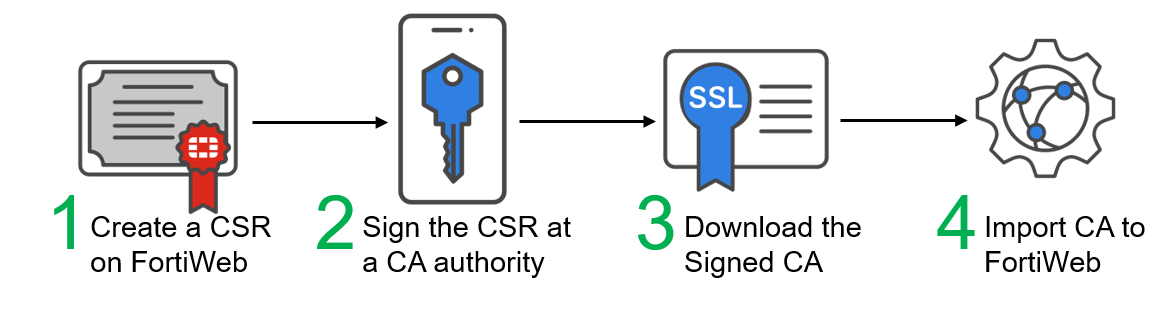 File based enrollment: Submit the CSR file to a certificate authority (CA) for signing. Once signed, upload the certificate to FortiWeb.