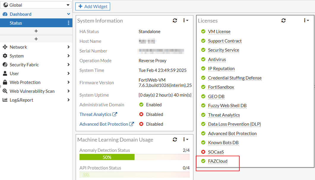 Before configuring FortiAnalyzer Cloud on FortiWeb, verify that the FortiAnalyzer Cloud license is active to ensure proper connectivity and log forwarding. You can check the license status directly from the FortiWeb Dashboard to confirm whether the service is enabled and valid.