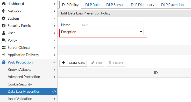 DLP Exceptions are configured independently and then assigned to DLP Policies through the Exception field. At runtime, FortiWeb evaluates DLP rules and exceptions in sequence; if an exception matches, the associated rule is bypassed.