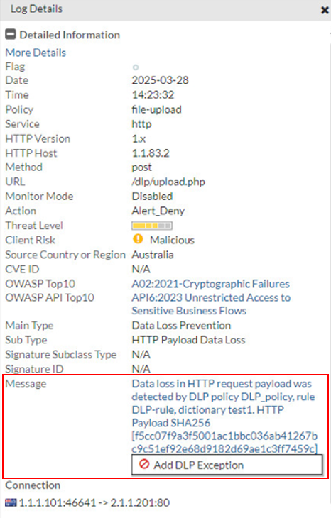 Go to Log&Report > Log Access > Attack, and find the attack logs with Main Type set to "Data Loss Prevention". Double-click a log entry to view the log details. If you believe the request was falsely detected as an attack, click the Message field, then click Add DLP Exception.