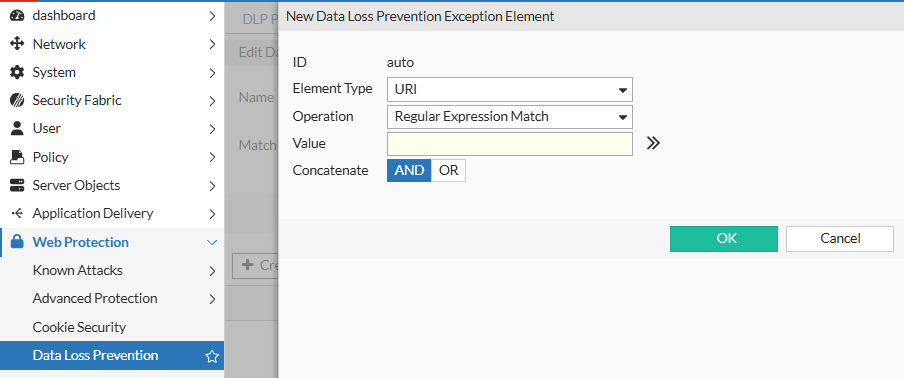 - Click OK to save the Data Loss Prevention Exception Element entry.