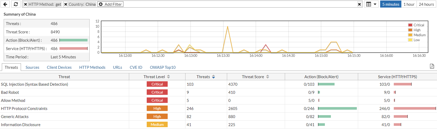 From here, you can also view information about specific types of threats, the source IP of attacks, the client devices that launched attacks, HTTP methods used, and targeted URLs for the specified country under the Threats, Sources, Client Devices, HTTP Methods, URLs, CVE ID, and OWASP Top10 tabs, respectively. You can use either the Add Filter icon to filter for these things, or select the relevant tab and double-click the row of the thing you want to know more about.