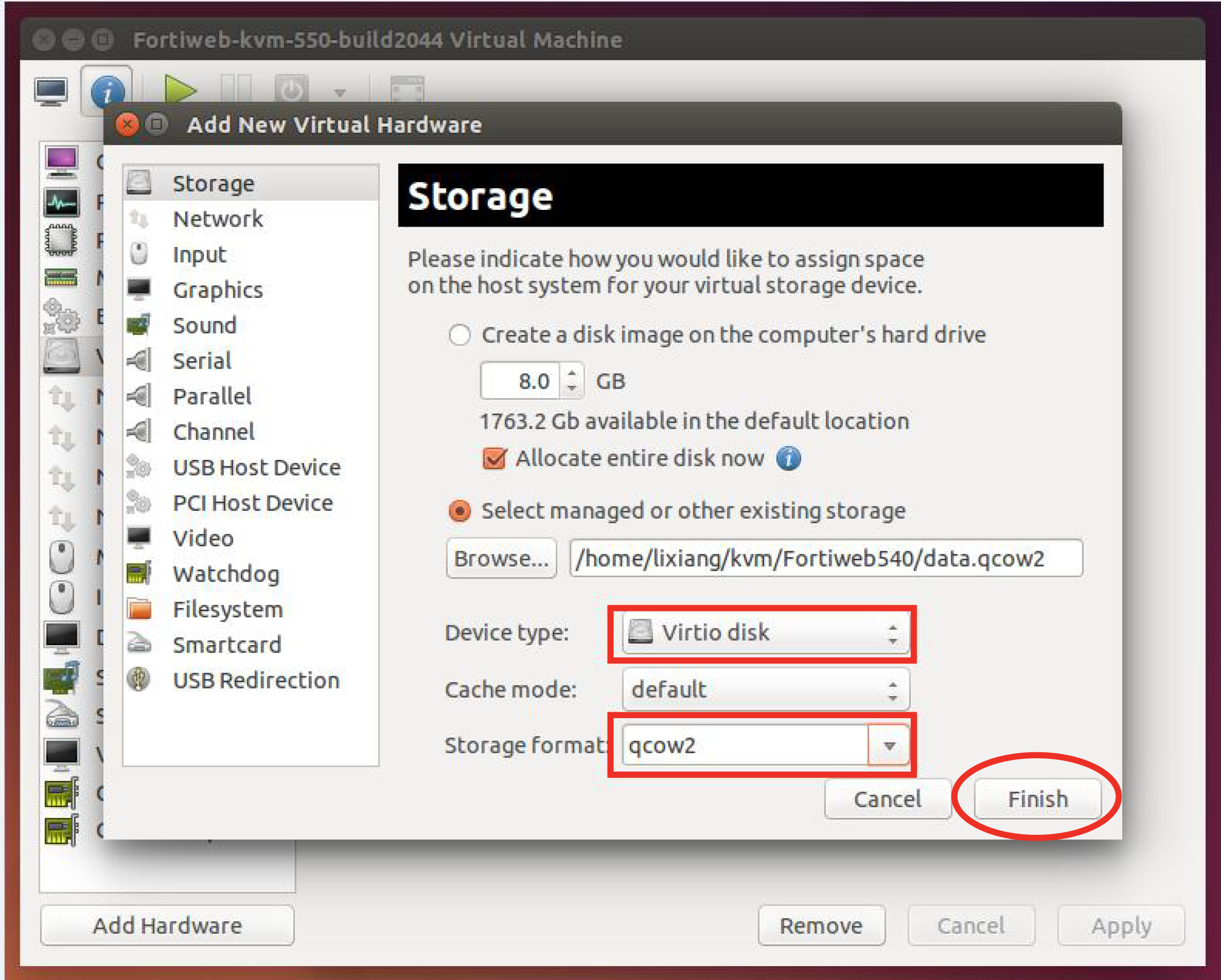 - For Device type, select Virtio disk, for Storage format, select qcow2, and then click Finish.